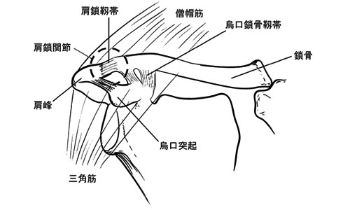 肩鎖関節脱臼とは鎖骨の外側と肩甲骨の「肩峰」とをつなぐ関節が外れてしまうケガのことです。