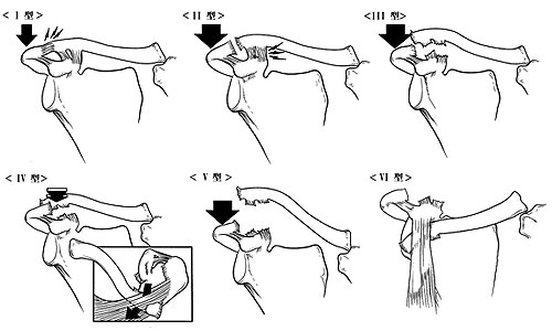| TypeⅥ(下方脱臼) | 肩鎖靱帯と烏口鎖骨靱帯ともに断裂している。鎖骨が下方に転位している |